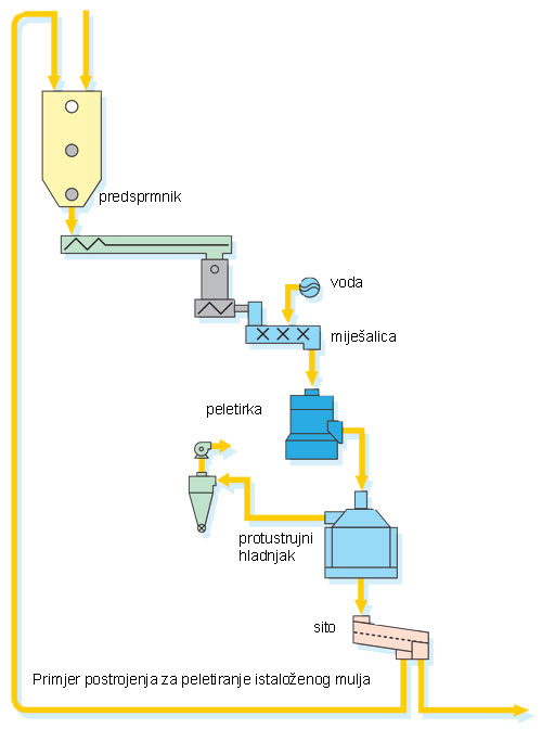 Da bi se uvijek prethodno obrađeni istaloženi mulj peletirao, mora se proizvesti od 60 - 95% sadržine tvrdog materijala. To se postiže dehidratizacijom s priključenim termičkim sušenjem ili kombinacijomobih tehnologija. Pripremni postupak nataloženog muljau tornju za truljenje djeluje pozitivnona proizvodnost (učinak) peletirke i na pritom nastalo trošenje kalupa.